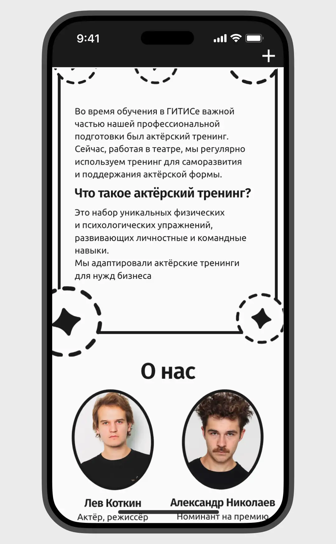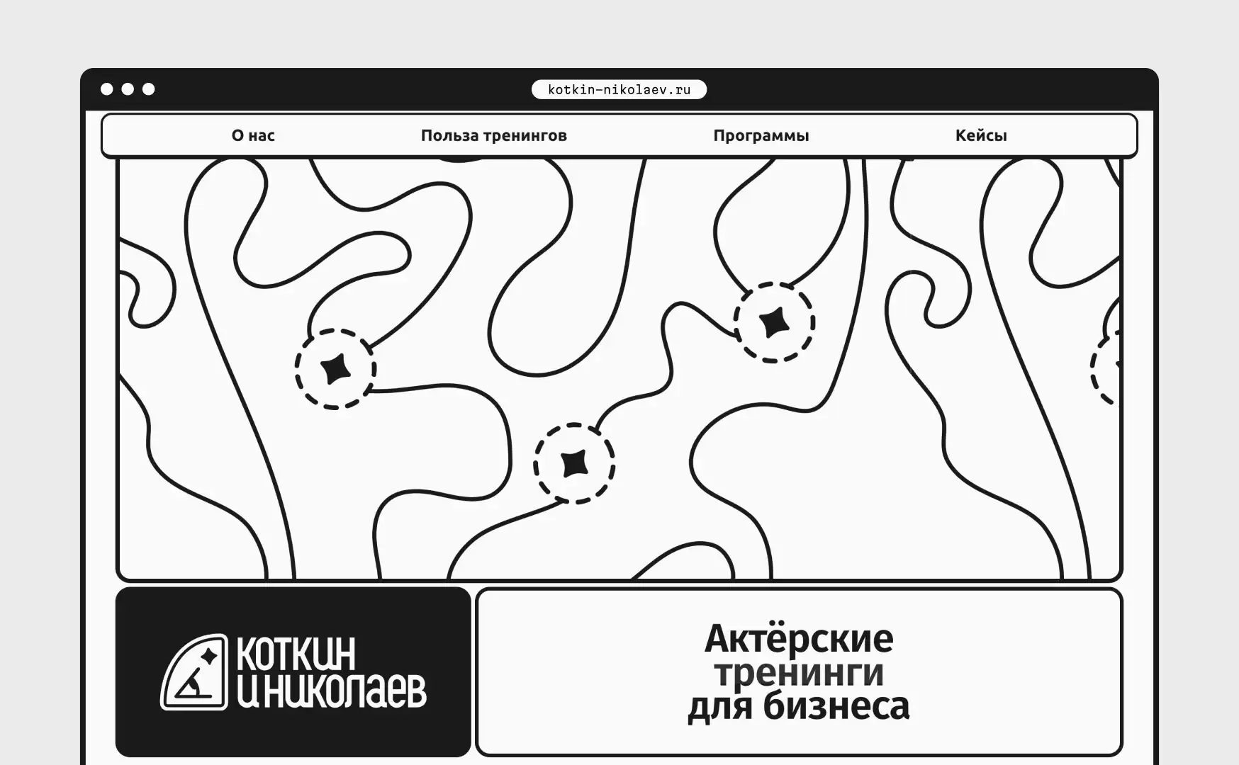 Я разработал для них простую айдентику, ключевым элементом которой является логотип. В его знаке соединились образы глаза, угла-поворота и географического азимута. В фирменных паттернах — почти сказочное ощущение поиска сокровища, дороги в неизведанное, приключенческого духа. Основным инструментом для продвижения своих услуг Лев и Саша решили сделать сайт. Я развил графическую систему и сверстал лендинг, в котором можно подробнее ознакомиться с предложением актёров и связаться с ними
